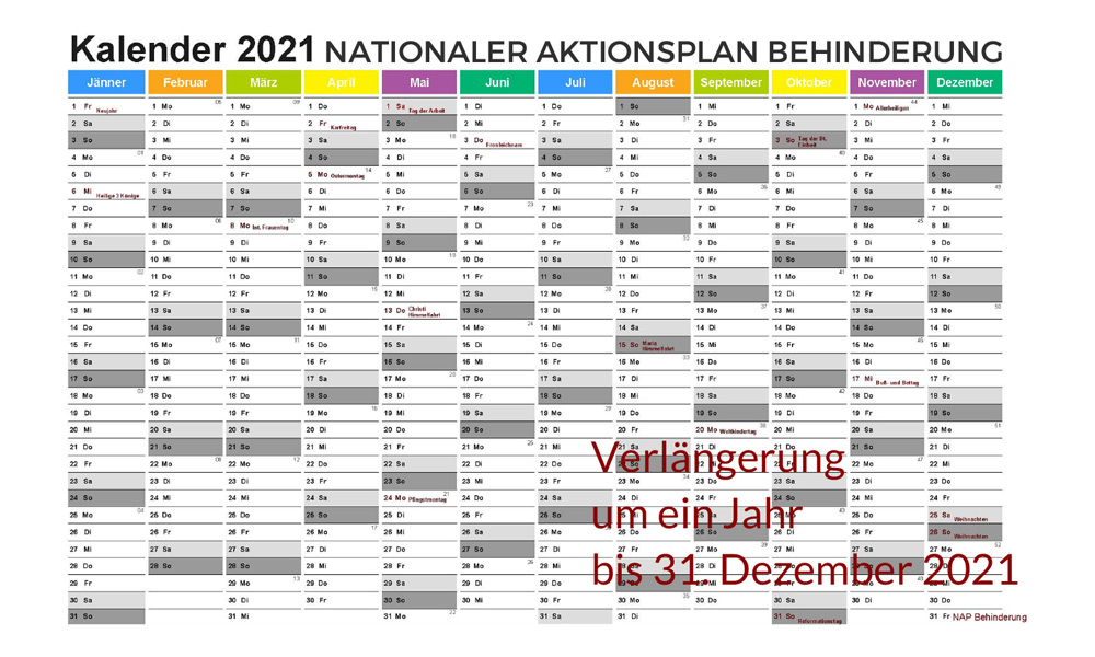 Der Nationale Aktionsplan Behinderung soll die Umsetzung der UN-Behindertenrechtskonvention in Österreich gewährleisten. Im Mittelpunkt steht das Ziel einer inklusiven Gesellschaft, wonach Menschen mit Behinderungen an allen gesellschaftlichen Aktivitäten teilhaben können. Nun wurde der Aktionsplan um ein Jahr bis 31. Dezember 2021 verlängert.