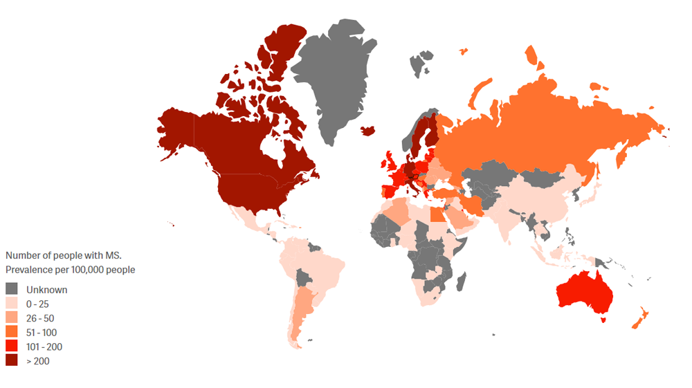 Die Schätzung der internationalen Multiple Sklerose Föderation (MS International Federation) zeigt, dass im weltweiten Durchschnitt zumindest eine von 3.000 Personen von Multipler Sklerose betroffen ist. Darüber hinaus geht aus der jüngsten Ausgabe des Multiple Sklerose-Atlas hervor, dass die Krankheitshäufigkeit seit der letzten internationalen Erhebung im Jahr 2013 in jeder Region der Welt gestiegen ist.